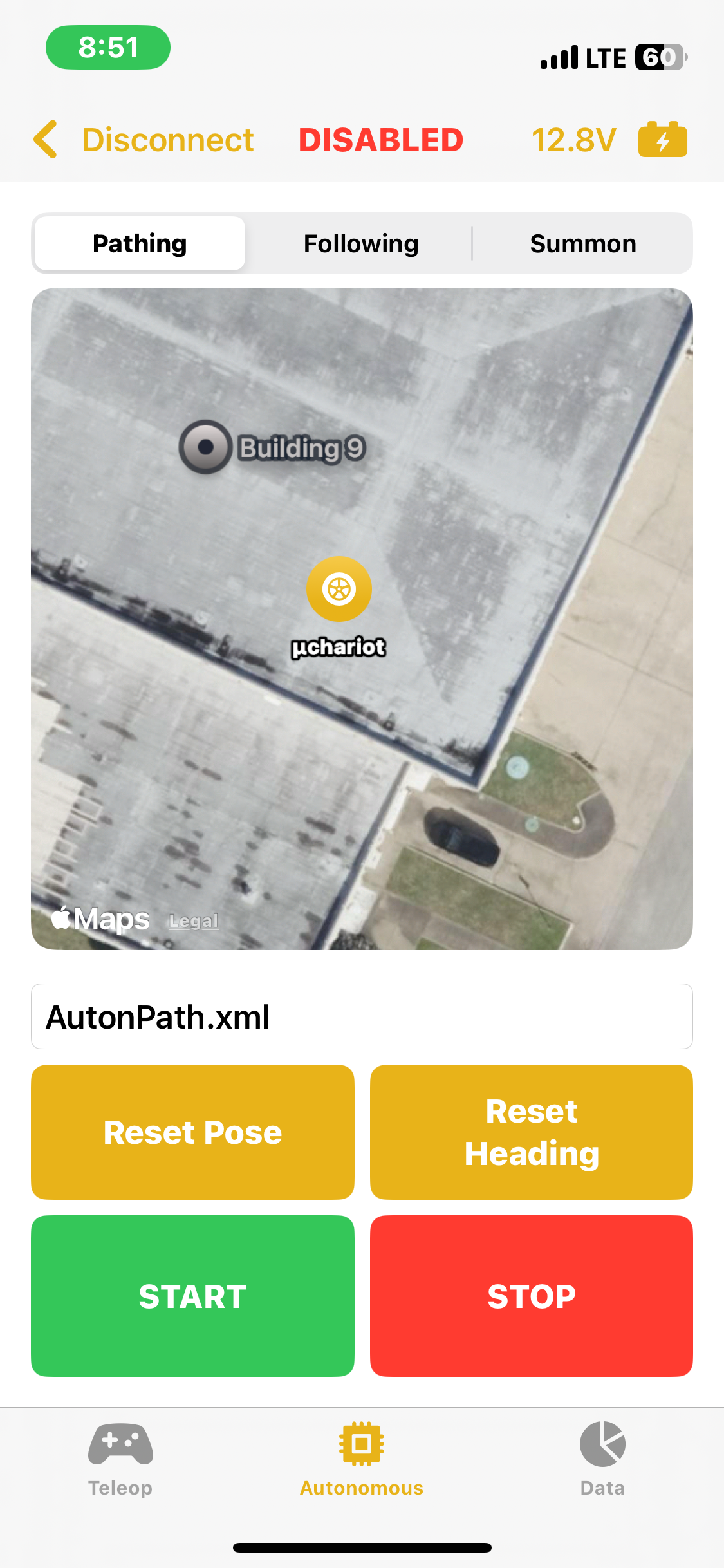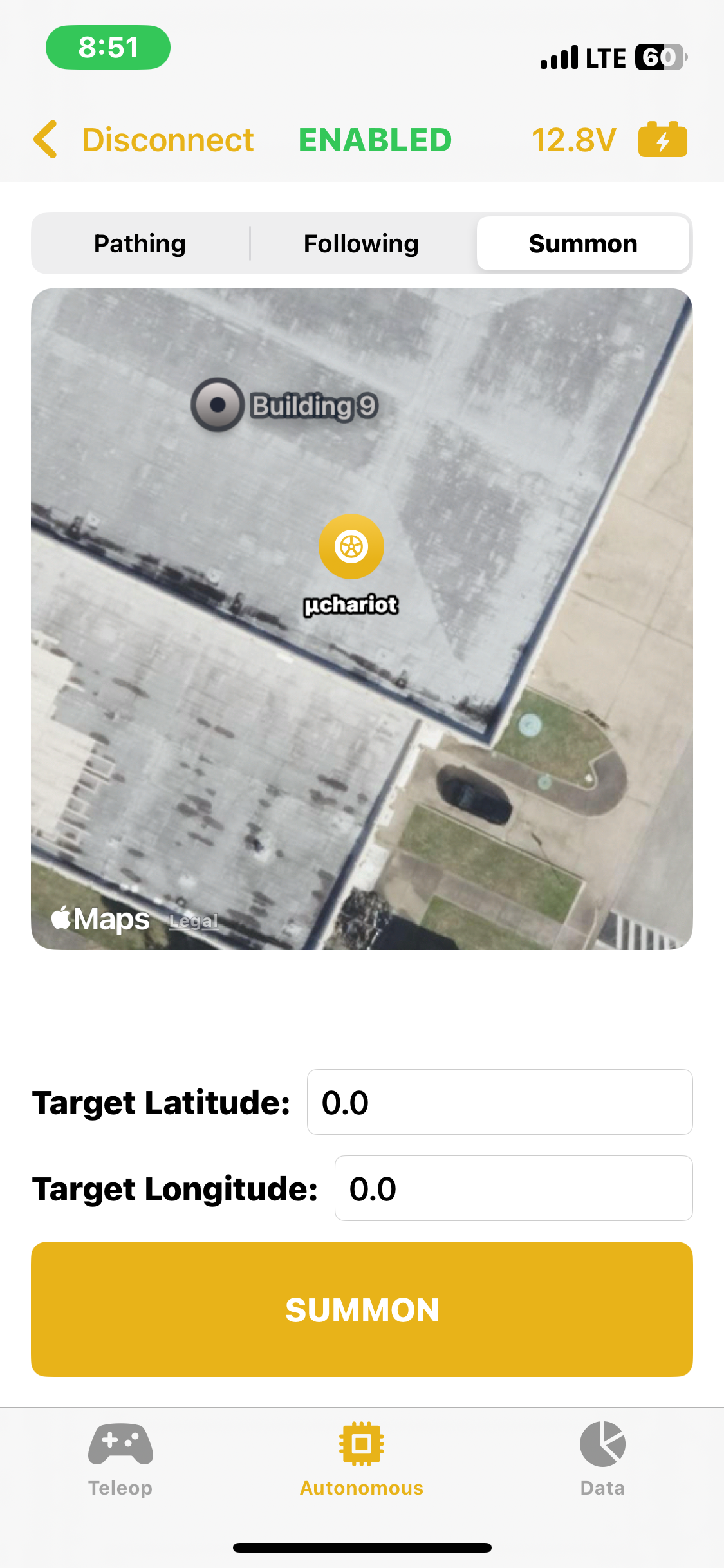 The app featured the ability to change the provided IP address, in the case of another robot with a different static IP or the static IP changed. The app had the ability to enable, disable, and emergency stop the robot all from your phone with an easy to push button located at the top of the screen. The main teleoperated screen allowed the driver to use a joystick located in the center of the screen to control the robot's movement. It also featured a live video feed if the robot were to be outfitted with a camera in the future. The Autonomous screen allowed for selection between the three autonomous modes, Pathing, Following, and Summon, each with their own controls and settings. The app featured emergency stop detection if your phone turned off, navigated away from the app, etc.